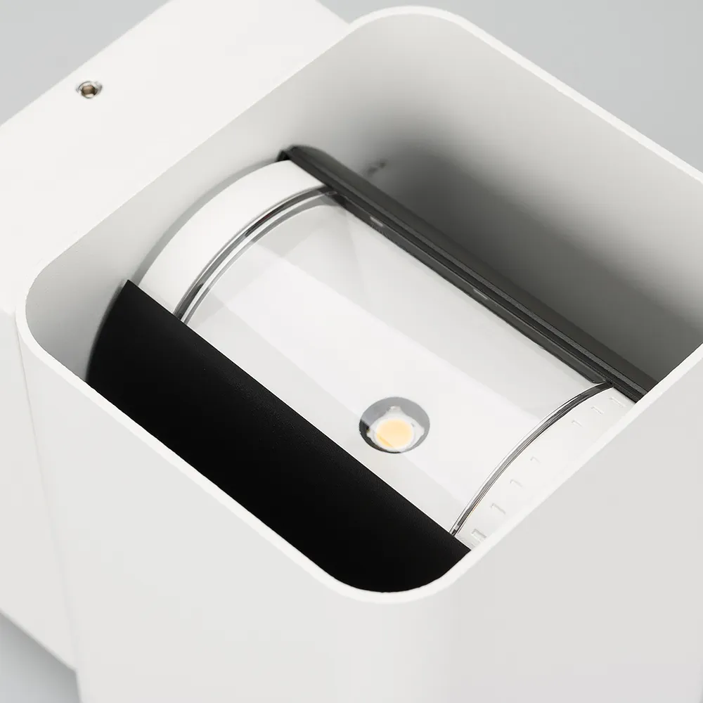 Уличный светодиодный светильник для стен, изменяемый угол освещения 0°-80°, свет вверх-вниз на 2 стороны. Цвет ТЕПЛЫЙ БЕЛЫЙ 3000К, светодиоды 2x6Вт CREE (750 лм). Влагозащищенный корпус IP54 - белый (RAL9003) алюминий, экран ударопрочный PC. Питание 230В, мощность 12 Вт. Размеры ВхШхГ -138х104х129 мм.