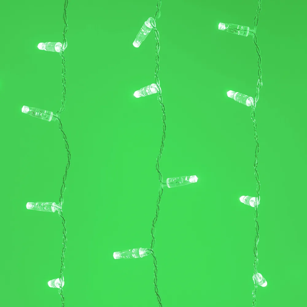 Светодиодный Занавес Classic. Размер 2000x3000 мм (длина 2000 мм, высота 3000 мм). 20 ниспадающих нитей длиной 3000 мм. 760 светодиодов размером 7 мм. Цвет свечения ЗЕЛЕНЫЙ, постоянное свечение и 8 динамических эффектов с резким световым рисунком (прозрачная вогнутая линза). Провод прозрачный, ПВХ. Питание 230 В, Мощность 60 Вт, защита IP65, применение в помещении и на улице под навесом. Аксессуар для подключения и выбора режима свечения в комплекте.
