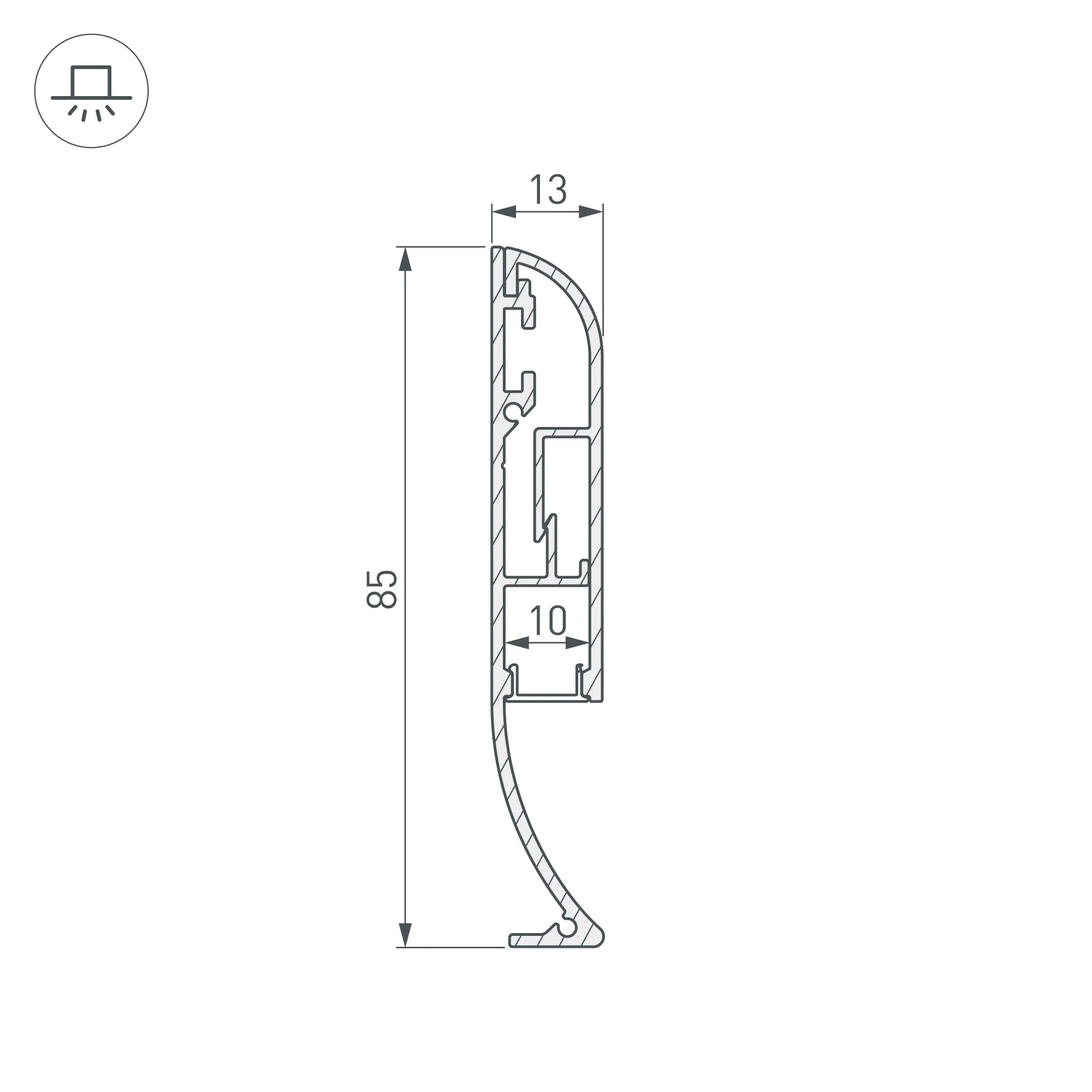 Комплект с экраном. Алюминиевый анодированный профиль-плинтус для светодиодных лент и линеек. Габаритные размеры (L×W×H): 2500x13x85 мм. Ширина площадки для ленты 10 мм. Аксессуары приобретаются отдельно. Цена за комплект.
