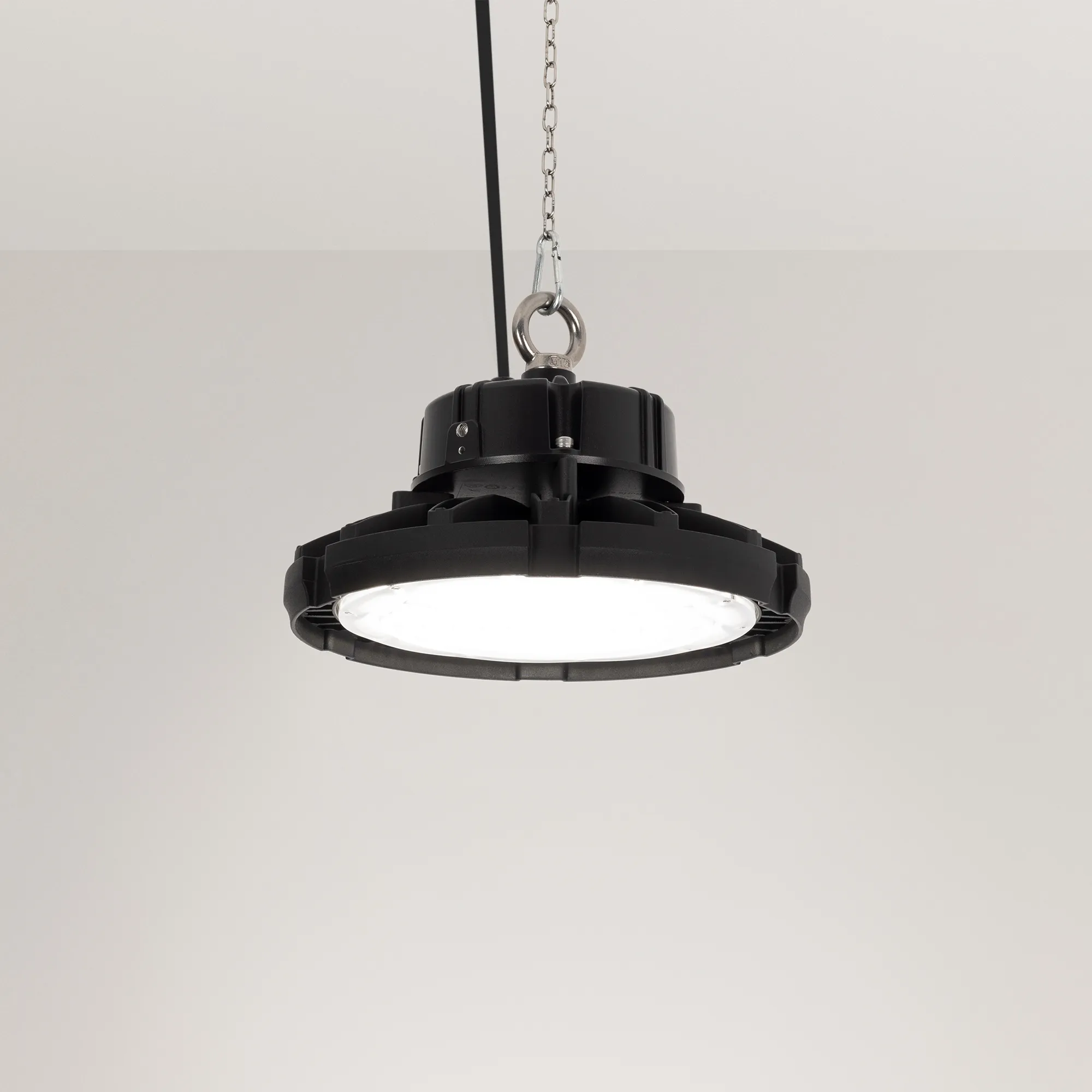 Поставка под заказ от 200 шт. Светильник для освещения складских и промышленных помещений. Мощность 150W, напряжение питания AC 220-240V/50Hz. CRI 80. Тип светодиодов SMD2835, с групповой оптической линзой. Цвет свечения ДНЕВНОЙ 5000K, световой поток 21000 Lm, угол рассеивания 60°. Цвет корпуса черный, линза из поликарбоната, степень влагозащиты IP65. Габариты Ф285xH193мм. Рым-болт в комплекте.