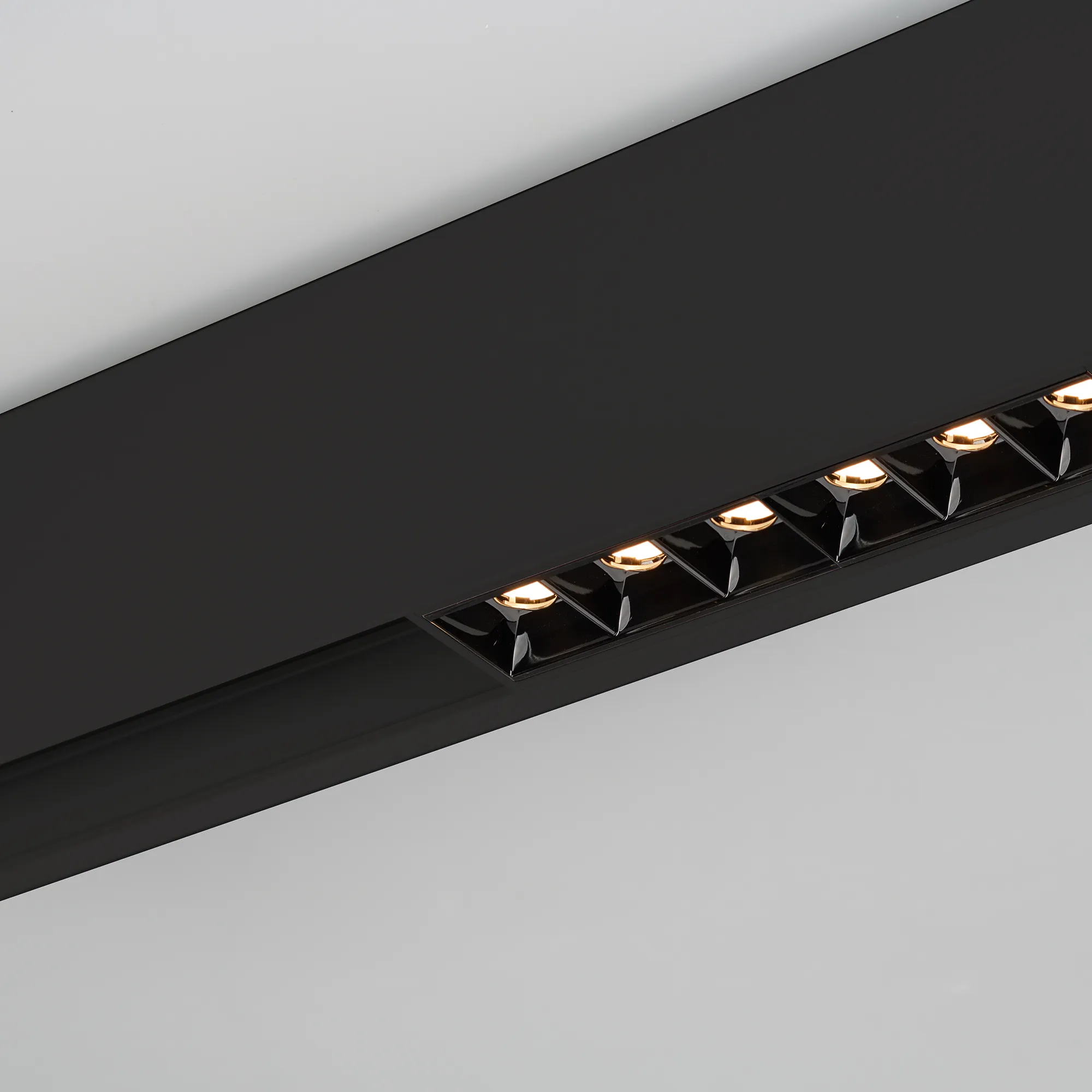 Светильник для магнитных треков шириной 45мм, 18Вт с управлением DALI. Цвет свечения ТЕПЛЫЙ 3000K, световой поток 1200лм, угол 15°, CRI>90. Корпус прямоугольный, металл, цвет черный, IP20. Размеры LxWxH 481x35x43мм. Входное напряжение DC24V, мощность 18Вт. Драйвер поставляется отдельно.