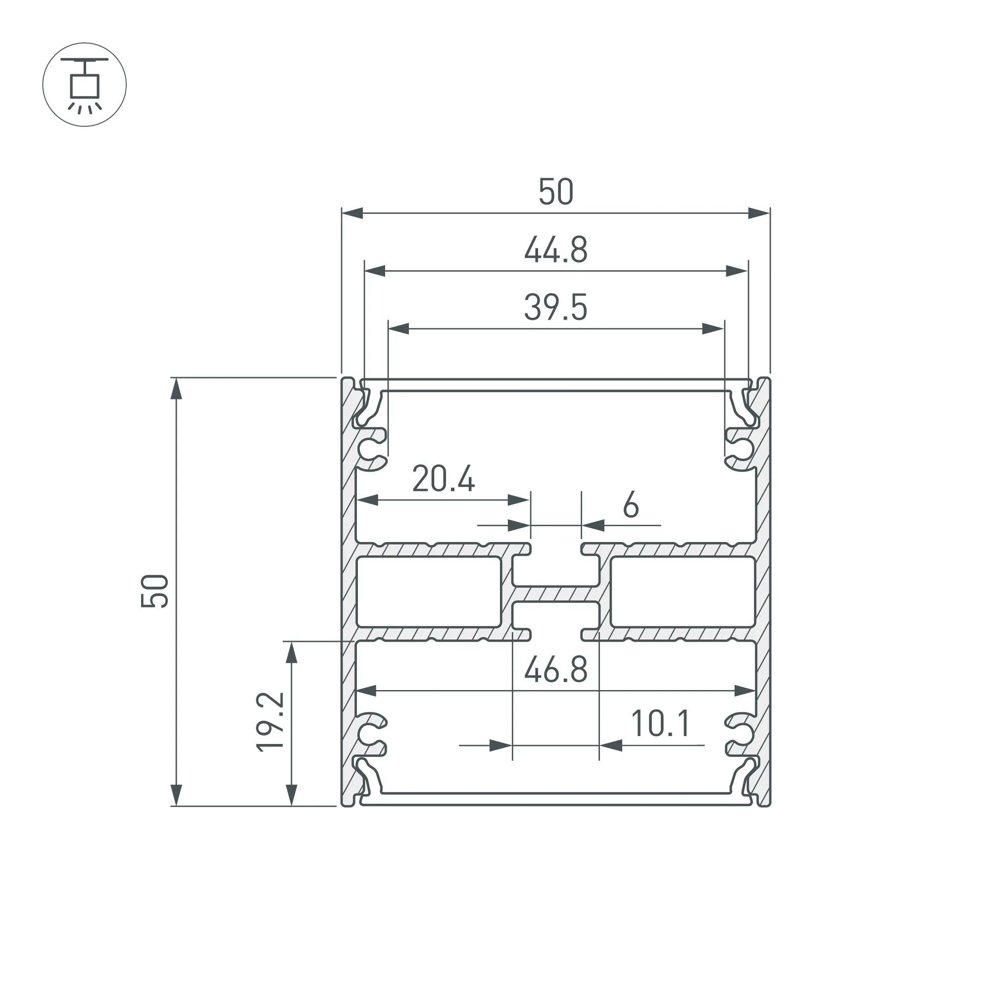 Алюминиевый анодированный профиль для светодиодных лент и линеек, свечение вверх и вниз. Габаритные размеры (L×W×H): 3000x50x50 мм. Ширина площадок для ленты 46,8 мм. Экраны, заглушки и другие аксессуары приобретаются отдельно. Цена за 1 метр.