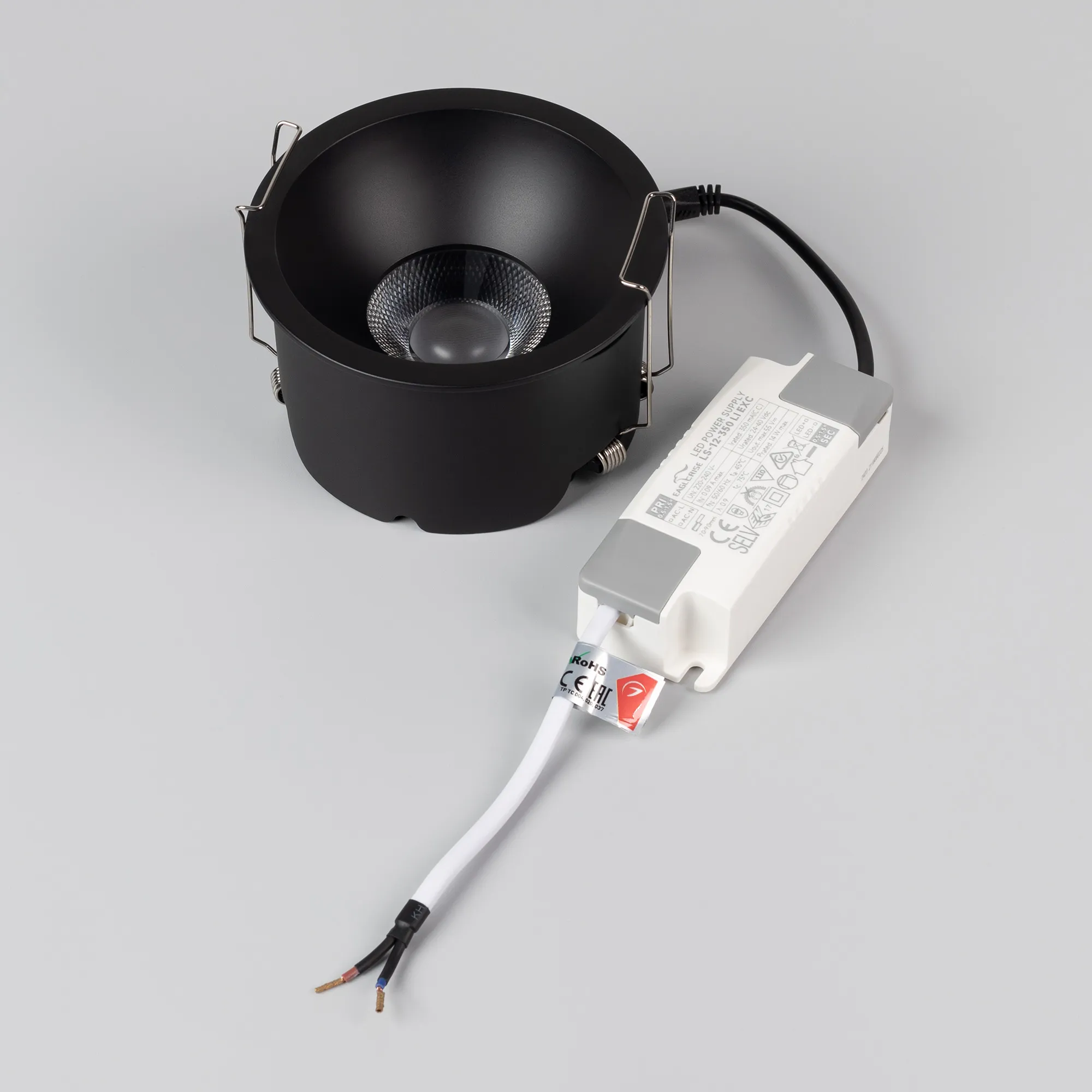 Встраиваемый светильник даунлайт. Мощность 15 Вт, св. поток 1260 лм, 84 лм/Вт, дневной 4000 K, CRI>90, угол 50°, напряжение питания 230 В. Чёрный круглый корпус из алюминия, степень защиты IP20. Размер: диаметр 106 мм, высота 63 мм. Монтаж встраиваемый, установочное отверстие: диаметр 95 мм. UGR<14. Драйвер 27-40 В, 350 мА, пульсация <2%.