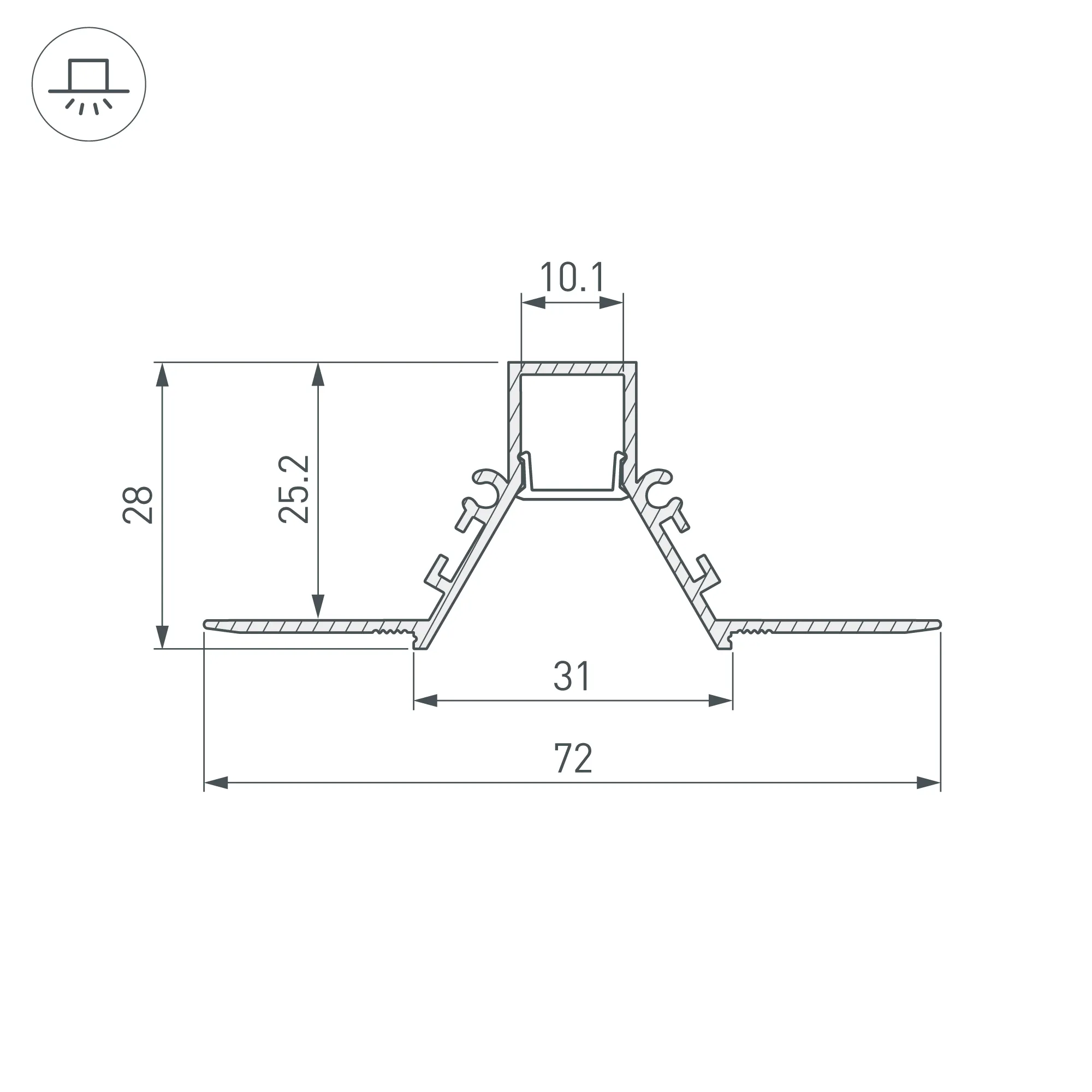 Алюминиевый профиль для светодиодных лент и линеек. Скрытая установка (под строительную отделку). Цвет - черный RAL9005 (порошковая окраска). Экран утоплен в плоскости профиля, что позволяет скрыть источник света от прямого контакта с глазами. Габаритные размеры (L×W×H): 2000x72x28 мм. Ширина площадки для ленты 10,1 мм. Экраны, заглушки и другие аксессуары приобретаются отдельно. Цена за 1 метр.