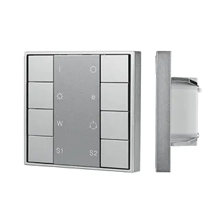 Встраиваемая кнопочная серая металлическая панель для работы по протоколу DALI DT8. Функция управления 1 группой / широковещательная. Установка номера группы выполняется переключателями на корпусе. 8 кнопок, 5 функций (ВКЛ / ВЫКЛ / ДИММИРОВАНИЕ / ИЗМЕНЕНИЕ ЦВЕТА (RGBW) / ВЫБОР СЦЕНЫ). Питание от шины DALI. Габариты панели 80x80x26.6 мм.