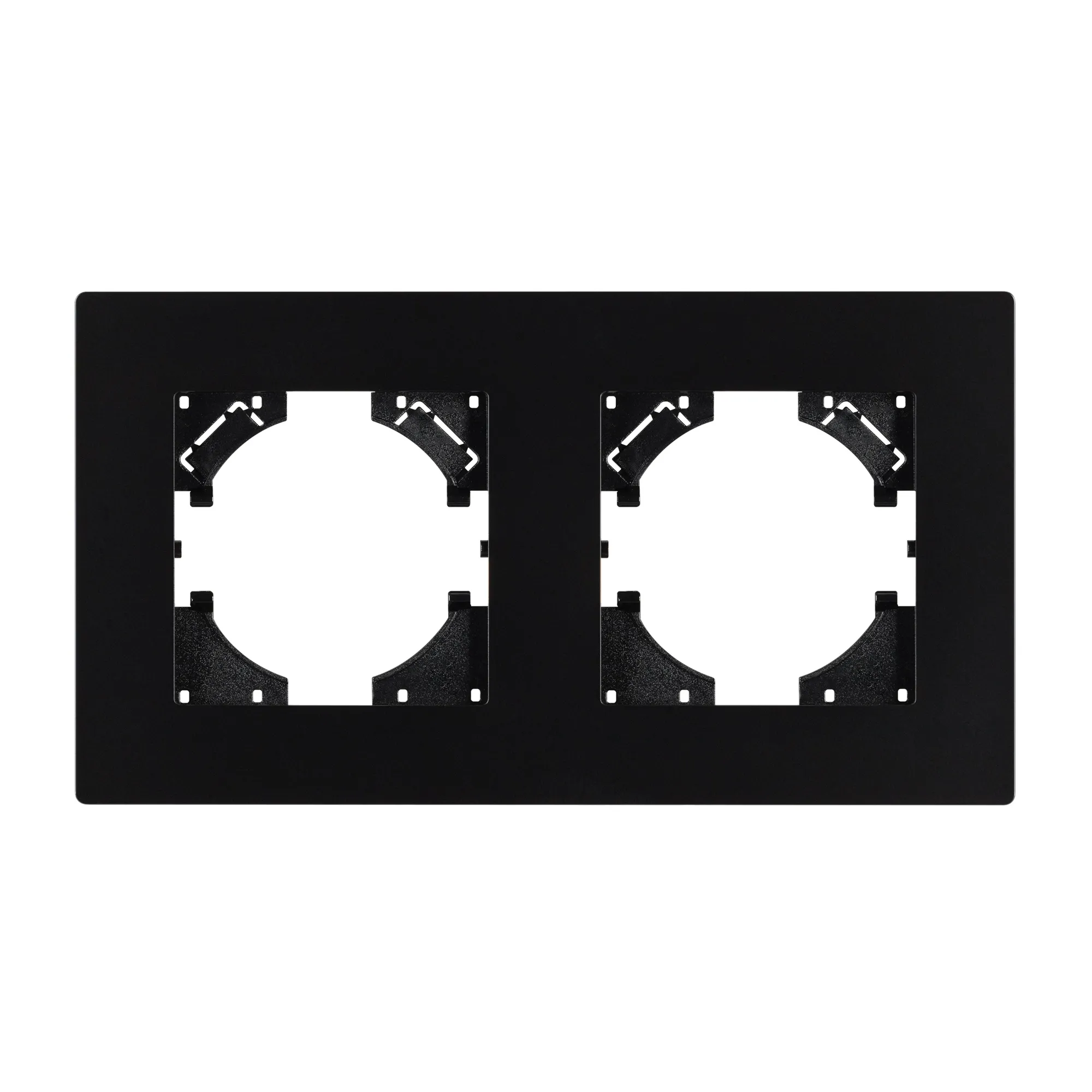 Рамка пластиковая на 2 поста, под встраиваемый механизм. Цвет - черный. Уровень герметичности IP20. Ориентация монтажа - горизонтальная (основным ориентиром служат посадочные выступы для накладки механизма).