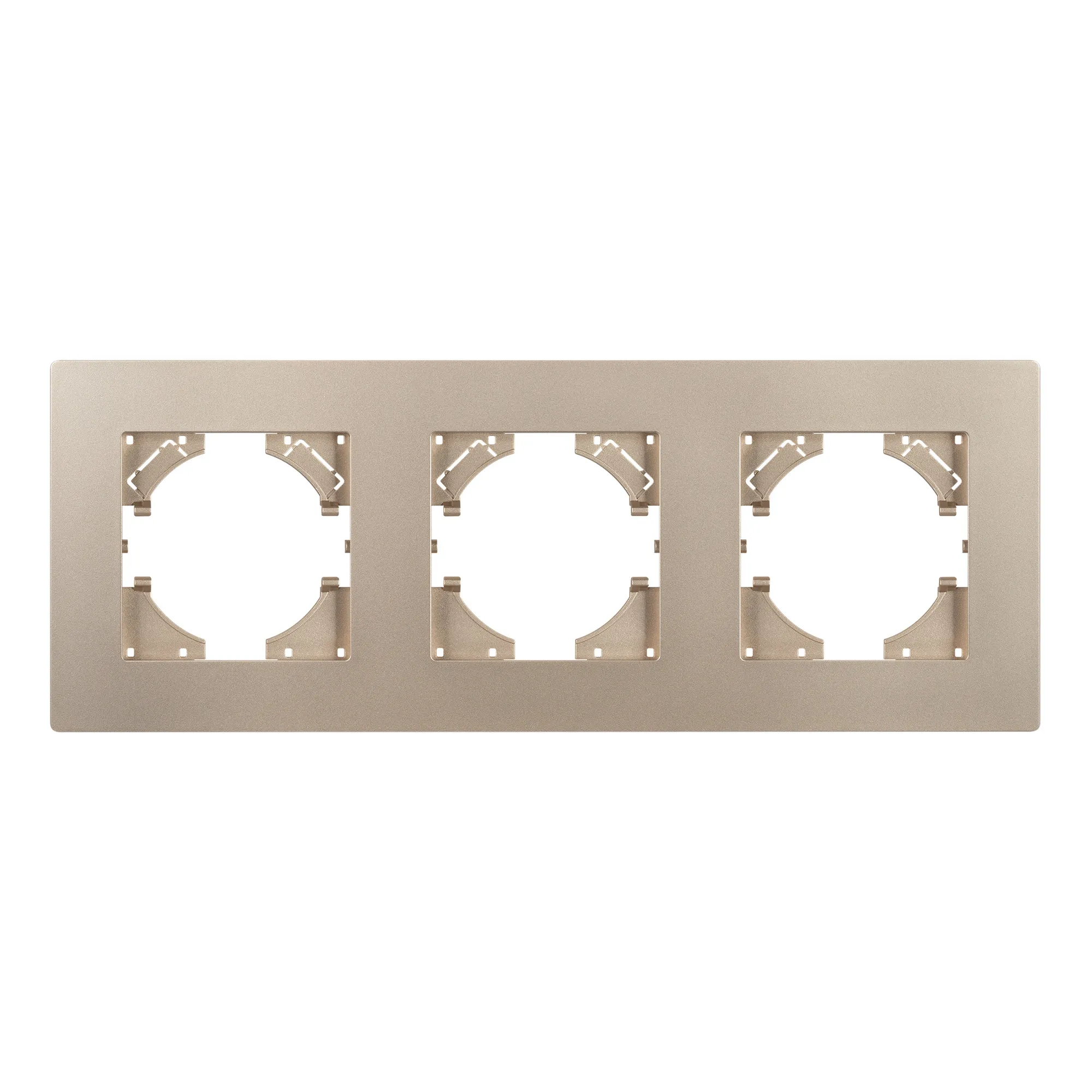 Рамка пластиковая на 3 поста, под встраиваемый механизм. Цвет - золотой. Уровень герметичности IP20. Ориентация монтажа - горизонтальная (основным ориентиром служат посадочные выступы для накладки механизма).