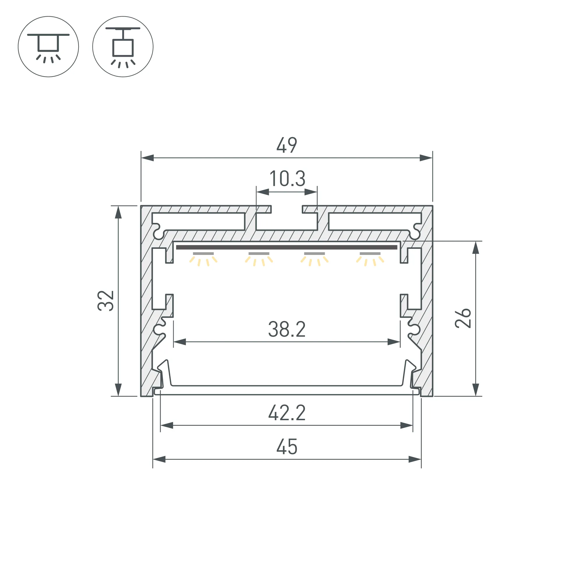 Алюминиевый анодированный профиль для светодиодных лент и линеек. Габаритные размеры (L×W×H): 3000x49x32 мм. Ширина площадки для ленты 38,2 мм. Экраны, заглушки и другие аксессуары приобретаются отдельно. Цена за 1 метр.